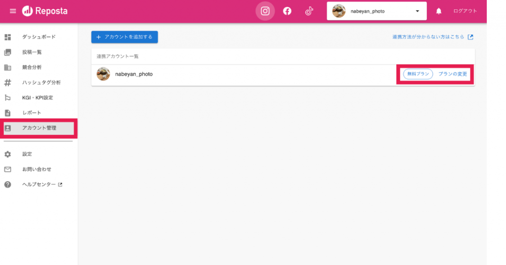 連携済みアカウント一覧が表示されますので、該当アカウント右側の「プラン変更」をクリックしてください。