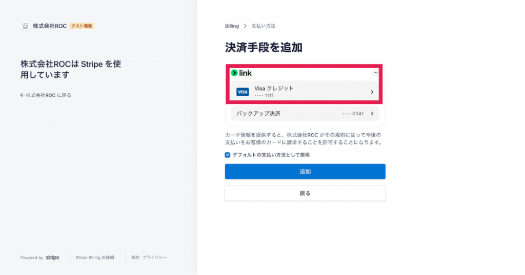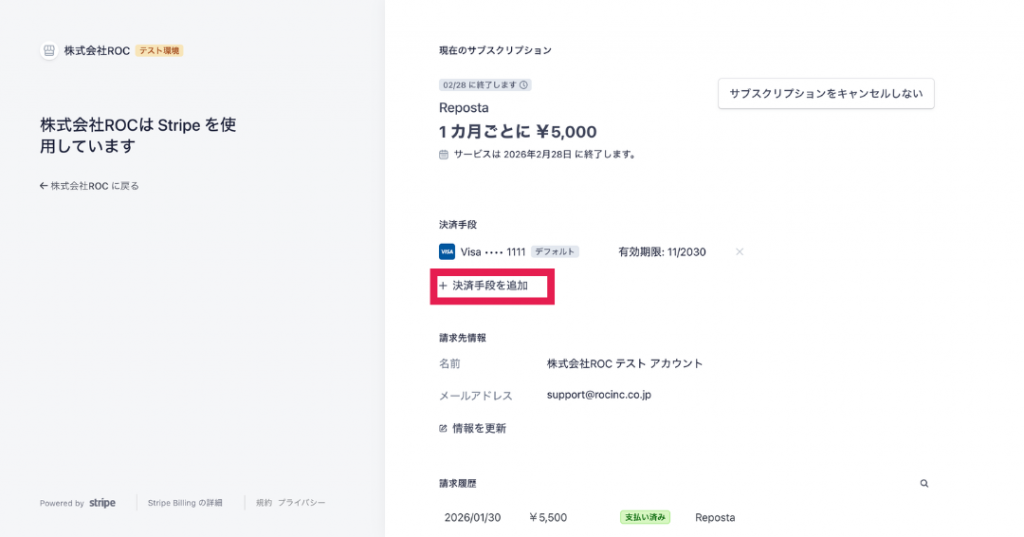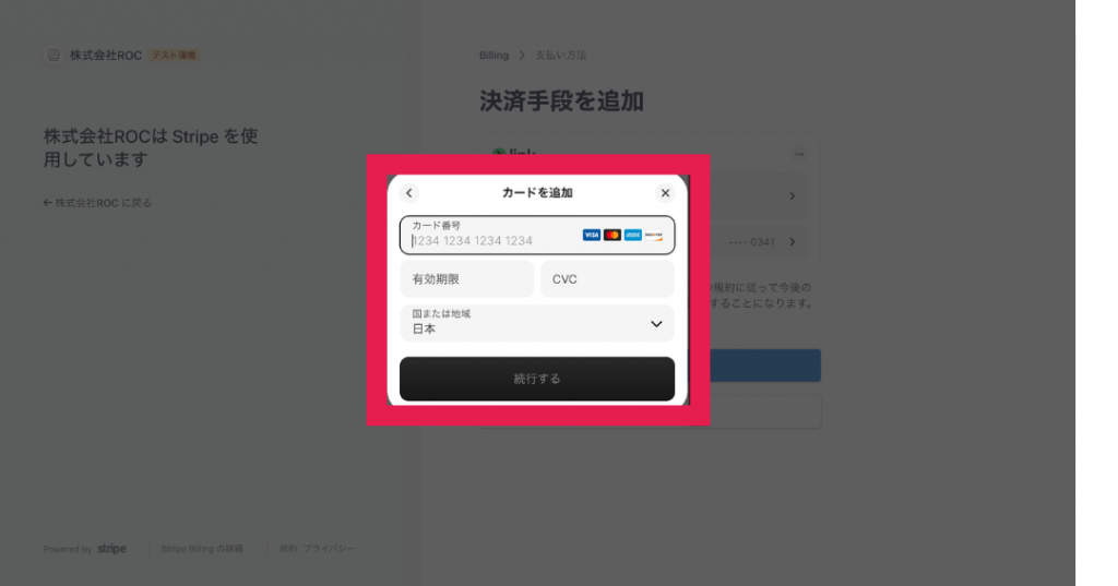 Stripeの画面に遷移しますので、遷移先の画面で「決済手段を追加」をクリックしてください。