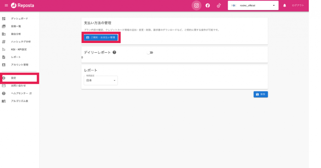 ダッシュボード左側メニューの「設定」をクリックしてください。